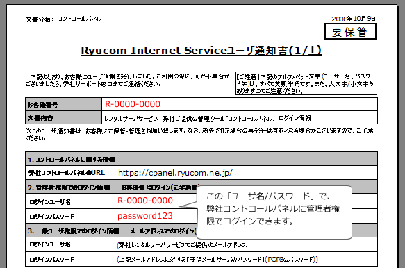 | 管理者権限でログインするイメージ | 例) 弊社からご郵送の「ユーザ通知書」の例 |
