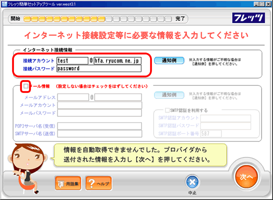 - 「メール情報」のチェックボックスは、チェックを外していただき、NTT西日本「フレッツ簡単セットアップツール」にてセットアップ完了後、弊社オンラインマニュアル「メールソフトの操作・設定方法」にてメールの設定をご実施いただくことをおすすめします。