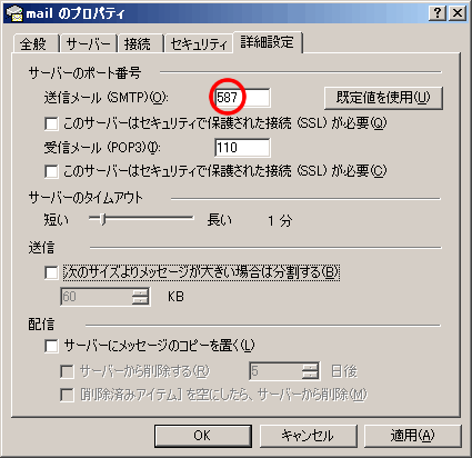 - 上記4によって、詳細設定画面が表示されますので、その上部あたりに下記のとおり「25」という数値を「587」に変更して[OK]ボタンをクリックして下さい。