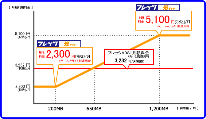 ひと月のインターネット利用量が 650MB までの場合は「フレッツADSL」よりも安価に